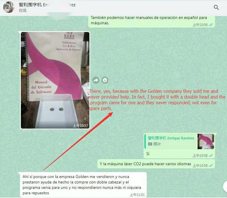 沒有對比就沒有傷害,智利新客戶在反應收到同行機器后無售后無配件無指導時,我們得到的我們客戶對我們的評價是一份大大的贊。感謝我們整個團隊的努力,一直將客戶服務放在第一位.