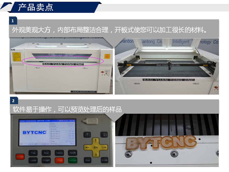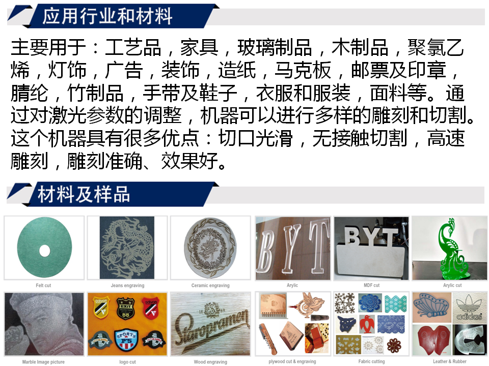 工藝品,家具,玻璃制品,木制品,聚氯乙烯,燈飾,廣告,裝飾,造紙,馬克板,郵票及印章,腈綸,竹制品,手帶及鞋子,衣服和服裝,面料等。通過對激光參數(shù)的調(diào)整,機器可以進行多樣的雕刻和切割。這個機器具有很多優(yōu)點:切口光滑,無接觸切割,高速雕刻,雕刻準確、效果好。