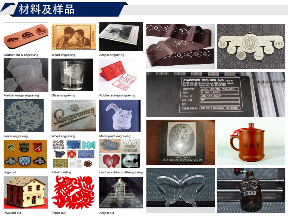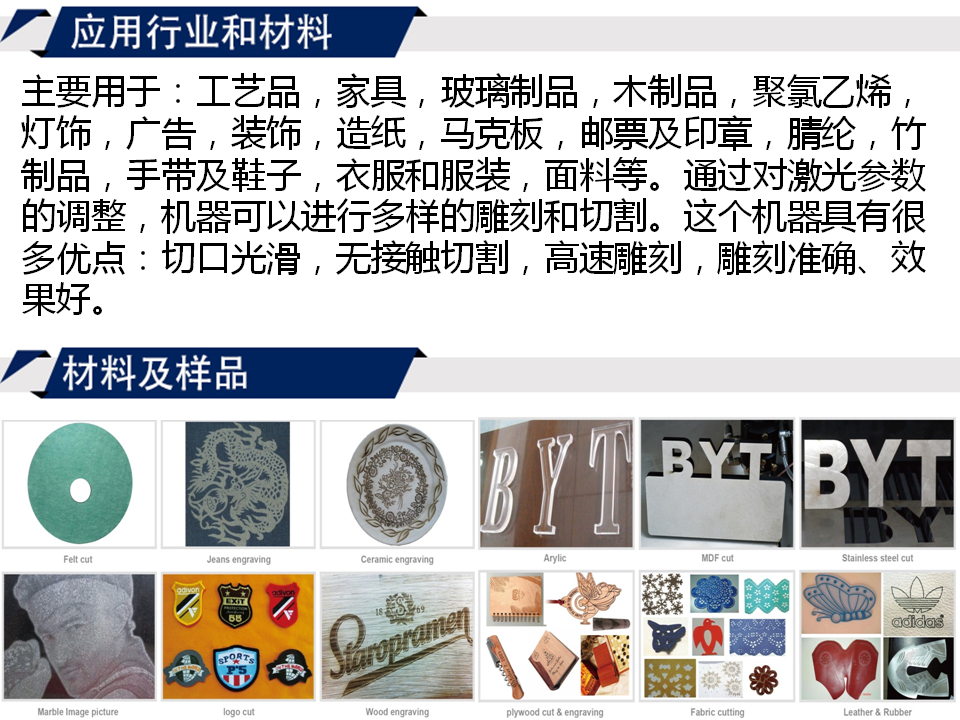 工藝品,家具,玻璃制品,木制品,聚氯乙烯,燈飾,廣告,裝飾,造紙,馬克板,郵票及印章,腈綸,竹制品,手帶及鞋子,衣服和服裝,面料等。通過對激光參數(shù)的調(diào)整,機(jī)器可以進(jìn)行多樣的雕刻和切割。這個機(jī)器具有很多優(yōu)點:切口光滑,無接觸切割,高速雕刻,雕刻準(zhǔn)確、效果好。