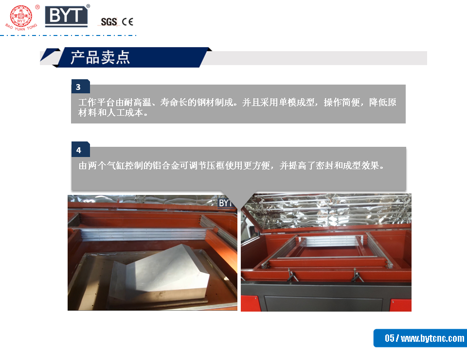 4.由兩個氣缸控制的鋁合金可調節壓框使用更方便,并提高了密封和成型效果。